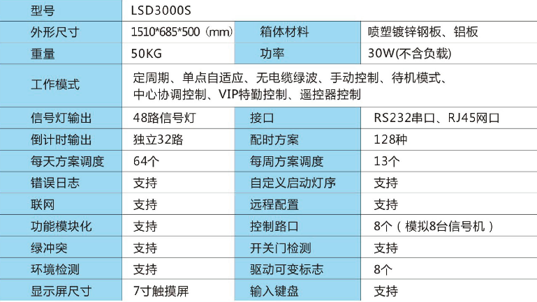LSD3000S型交通信號控制機采用先進,穩定、可靠的模塊化多處理器、多總線系統結構。采用高速ARM控制器及大規模集成電路,實時運算道路交通信息,如道路交通狀態、道路車流量。全部信號機可以組成城城網,完成于指揮中心信息交換。根據城市交通模型進行云計算,計算數據精準。帶有一塊7寸液晶觸摸顯示屏,和一個數字鍵盤。